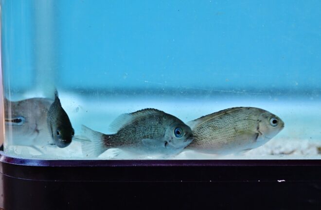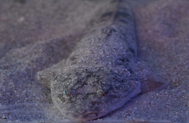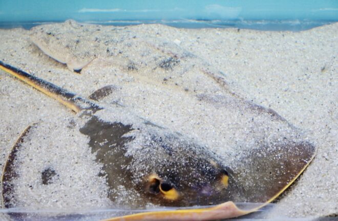 大人に人気だったのが、120㎝水槽で泳ぐアカエイやマゴチ、アオハタのいる水槽。いやいや、全然泳いでないんですけど。特にマゴチ。本来より底砂を若干少なくして、魚を見える化。ほぼほぼ動かない、それでも存在感のあるユーモラスな光景が印象的でした。