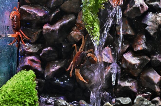 ポンプやフィルターのスペースをうまく確保した自信作の滝水槽。2~3匹のサワガニがわちゃわちゃ。一心不乱に登っているところを見ると、本物の滝と思ってくれているみたい。