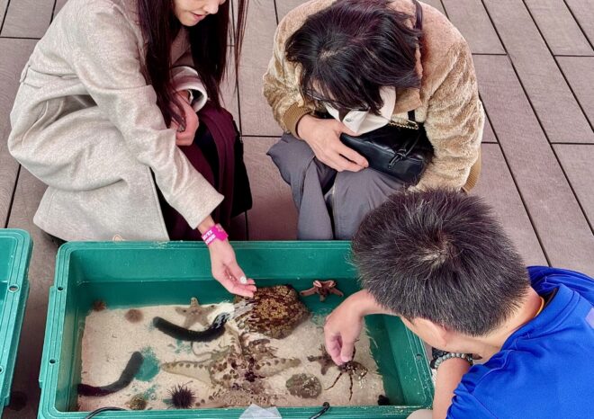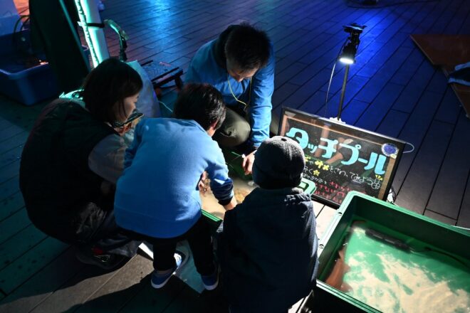 タッチプールはいつも子どもたちの人気者。テンジクザメやマンジュウヒトデ、クモヒトデ、ナマコなどなど。