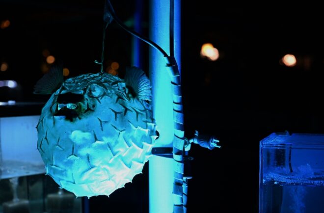巨大石垣フグの剥製もライトに照らし出されて独特の雰囲気に。