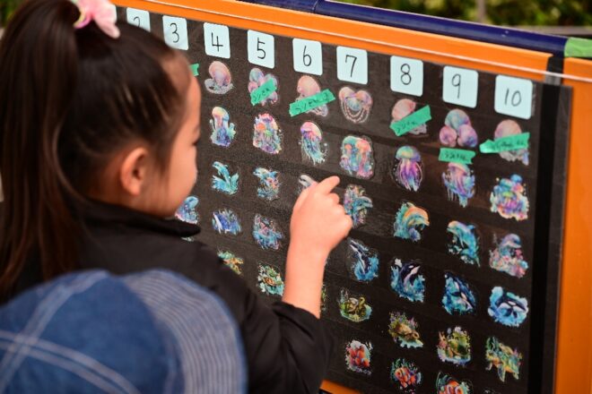 「でもさすがに魚を持って帰ってもらうわけにはいかないので、参加賞としてスペシャルな海シリーズのステッカーを用意しました!」。これがえらいウケて、キラキラ好きの女子に大人気でした。