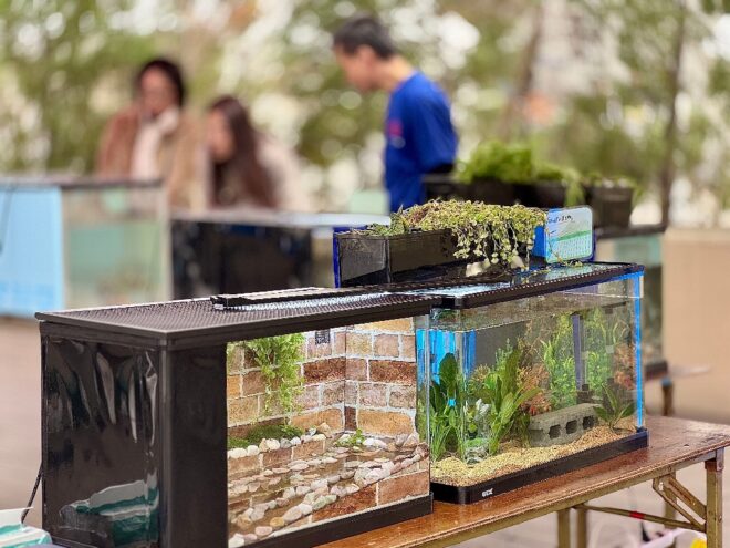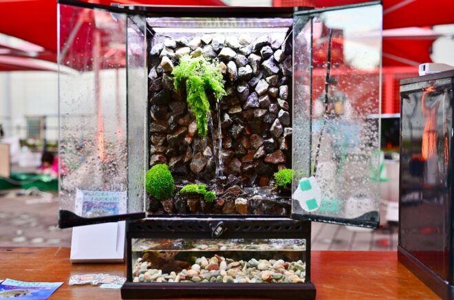 さめっちワールドの水槽もひときわ引き立ちます。コケや石などを使って、一見パルダリウムにも見える新発想の「滝リウム」。ポンプで水をくみ上げて、手製のフィルターを経由して滝のようなシーンを再現。