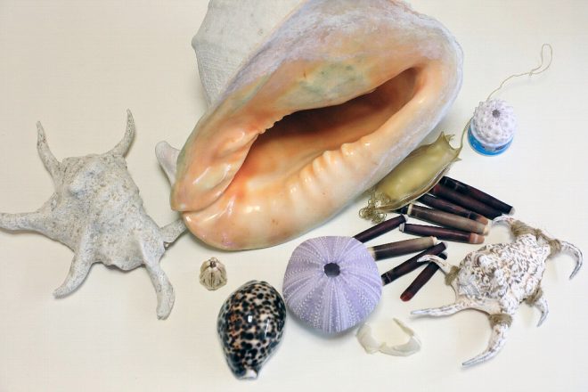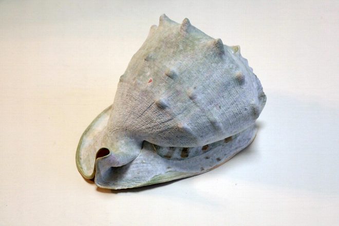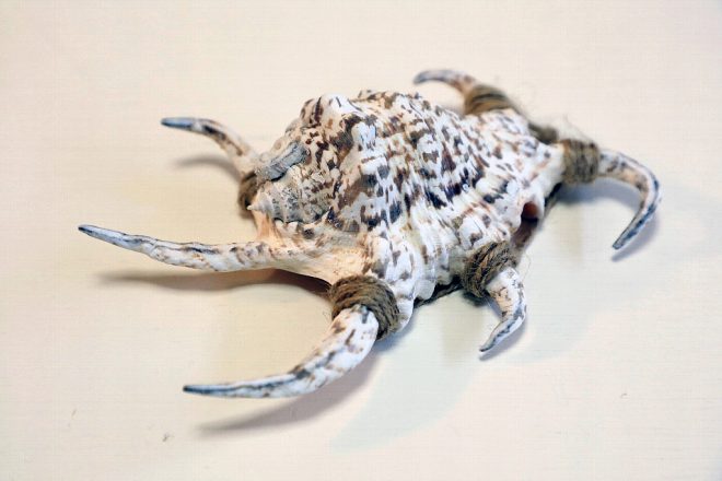 スイジガイの貝殻。外観をよく見ると「水」という漢字に似ているので、「水字」→スイジカイとなったそうです。殻が硬くて6本の突起が特徴で、沖縄では各家庭の玄関などに魔よけとしてぶら下げてあったり、アクセサリーとしても利用されています。