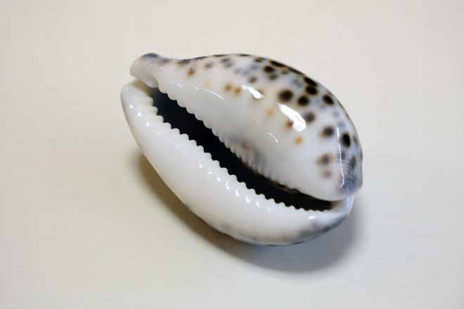 少し大きめのスイジガイ。スイジガイの仲間(クモガイやマガキガイなど)は、生きている時はゾウの鼻のような口とピョンと飛び出た2つの目がかなりユニークなのだとか。「気持ち悪がる人もおられますが(笑)」。