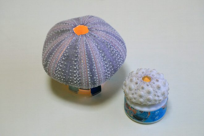 シラヒゲウニの殻でつくったウニランプ。殻の中にはランプが内蔵し、ちょっとしたアクセサリーのようなテイスト。イベントでは工作体験などで使うことが多く、ランプがともった時の幻想的な優しい光がとってもエキゾチックで人気があります。こうしてみると、海の生きものたちの中には、死んでからもきれいなかたちを残してくれて再利用できるものが多いのは、ちょっと感動してしまいます。