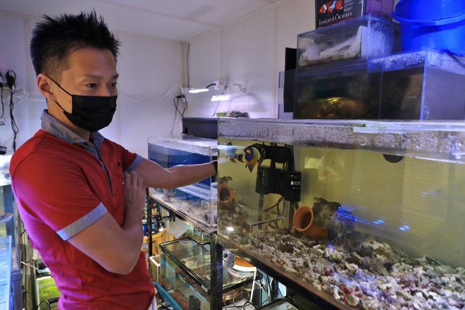 前回ご紹介した水槽小屋。たくさんの海水魚が河村さんの手によってしっかり飼育管理され、まさに亀岡唯一の美ら海を醸し出しています。