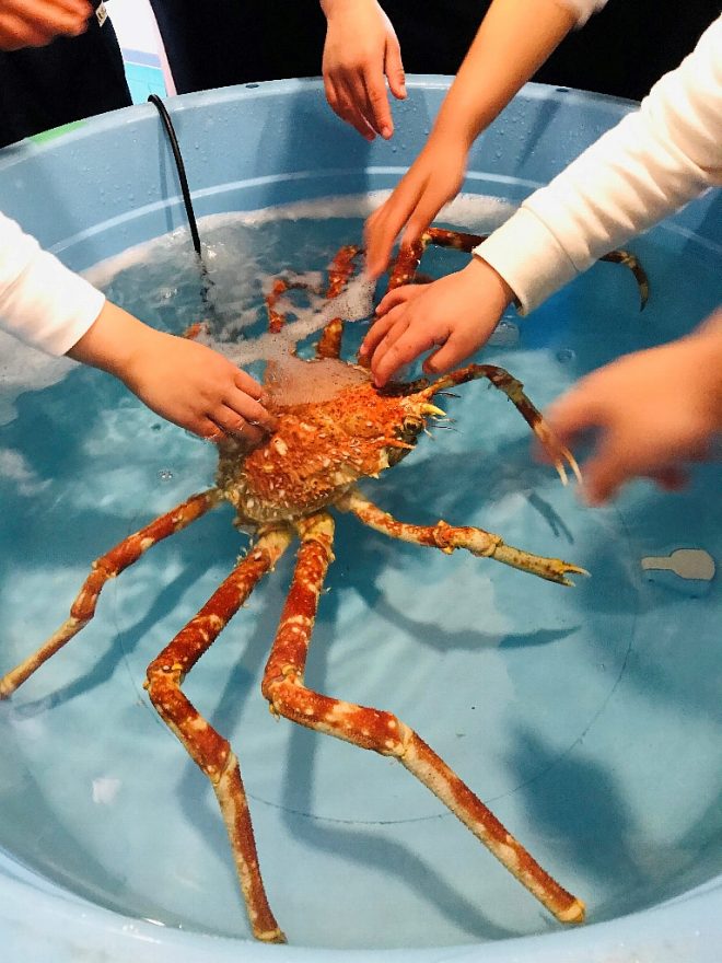 特に人気だったタカアシガニ。この時はコロナの影響で遠足に行けない幼稚園からのオーダーで開催されました。こちらから園に出向いて定番のタッチプール。「誰もが大変な思いをした時だったからこそ、いつまでも心に残る出来事にしてあげたかったんです」。お寿司が食べたくなった、なんて子はいませんでしたよね(笑)。