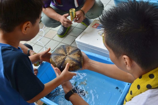 普段なかなか見ることのないマンジュウヒトデをタッチ。上からみると丸いかたちをしていますが、管足(かんそく)と呼ばれる黒っぽい細長い管はしっかりヒトデの形に配列されているのがわかります。じかに見てふれてこそのタッチプール。こうした子どもたちの貴重な体験が、将来のアクアリストを生み出す種になっていくのかも知れません。