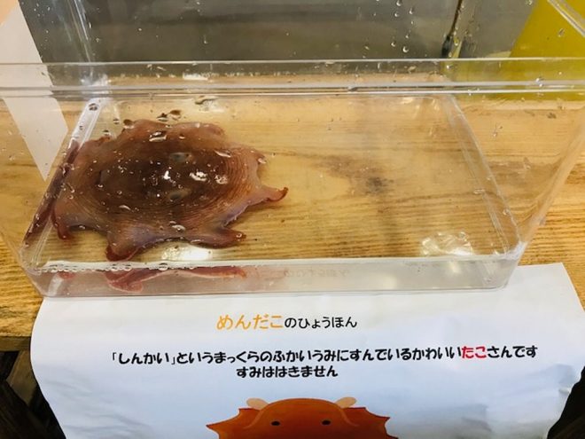 水族館でもめったにお目にかからない珍しいメンダコの標本を展示。太平洋で網にかかり、☆になってしまったものを、無傷のきれいな状態で冷凍保存して現地から知り合いを通じて送ってもらいました。とてもやわらかい体にやさしくタッチ。このタコに出会うこともふれることも普通ではまずできないそうです。大変貴重な個体なので、現在は標本にして大切に保管しています。