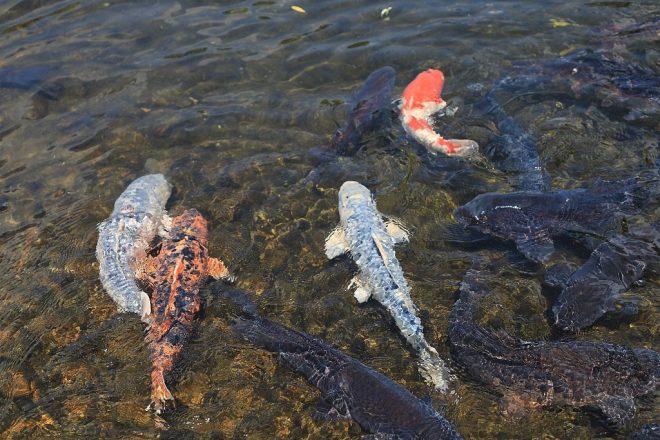 池にはコイたちもゆうゆうと。エサをやりたい人はショップ「名水の里」でどうぞ。
