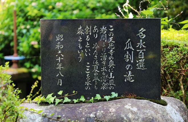 瓜割の滝の命名由来が刻み込まれた石碑も。