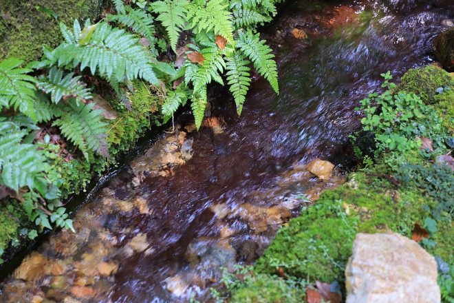 意識してよく観察してみると、こんなところまで赤く染まり、ここにもベニマダラが生息していることがわかります。水がきれいだけでは生育しないベニマダラ。逆にいうと、ベニマダラが生息しているところは場所は清らかで美味しい水が豊富に流れている証しでもあります。