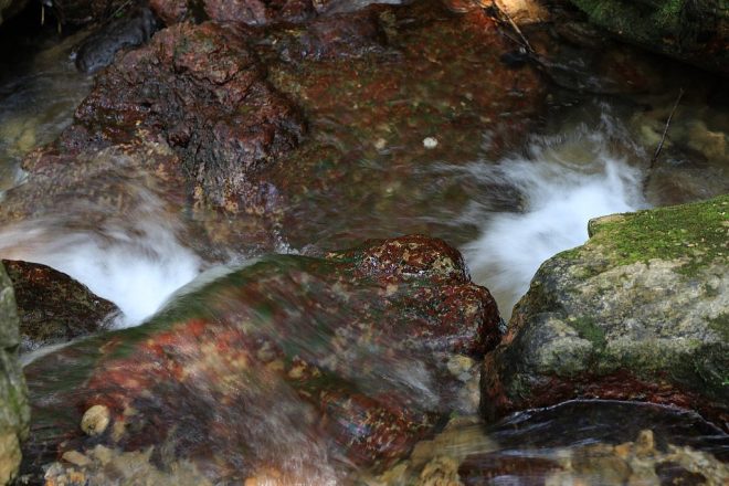 さっきから気になっていたことがひとつ。勢いよく上がる水しぶきの一方で、ところどころに赤褐色の岩肌が見えます。そういう色の石のせい?それともほかに要因が?