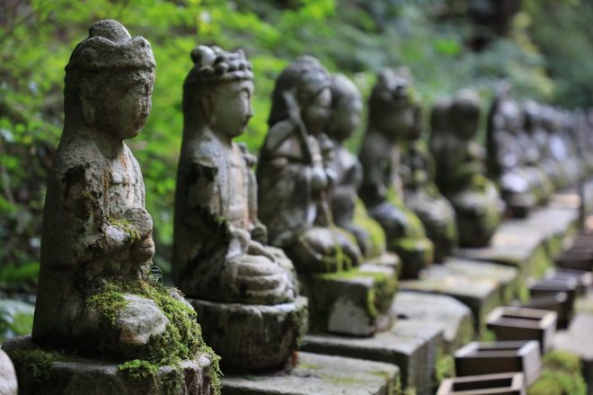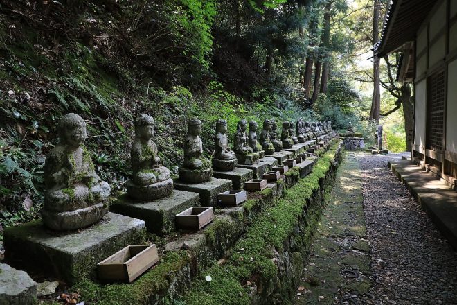 滝から少し外れたところには、四国八十八カ所にちなんだ八十八体の石仏が並んでいます。これらは、かつて弘法大師が佐渡の石工につくらせたものだといわれています。