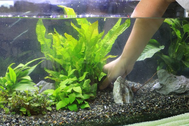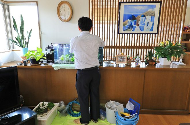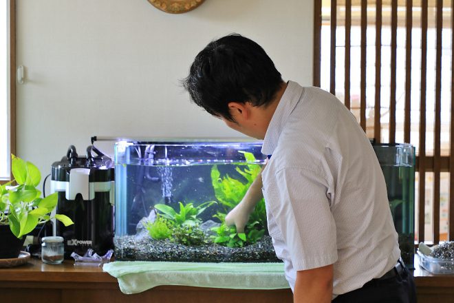 水の交換が終わったら、今度は水草の模様替え。ミクロソリウムやパールグラス、アヌビアスナナなどが手際よく投入されていきます。