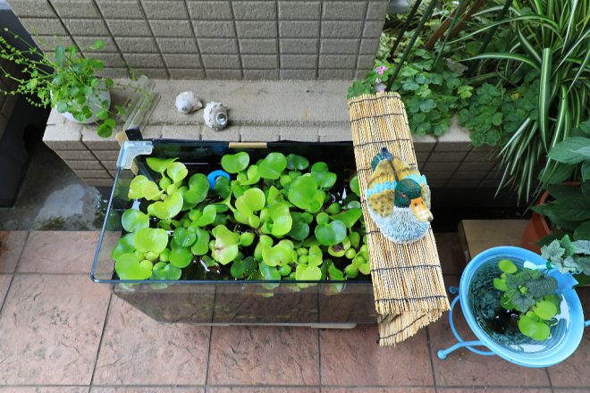 確かにベランダに水槽がありました。よくみると、10匹ほどのメダカが泳いでます。実は、4年前にアクアを始めた当初の「初代水槽」がこれなのだとか。同じKOTOBUKIの水槽で、こちらは60㎝。その後サイズアップを希望し、現在の90㎝水槽に落ち着いたというわけです。ベランダのメダカは奥様自らが飼育。もしまた慣れてきたら、メインの水槽もご自身で飼育できるようになるかもしれませんね、と投げかけてみましたが「いえいえ、もう手出しはしません(笑)」