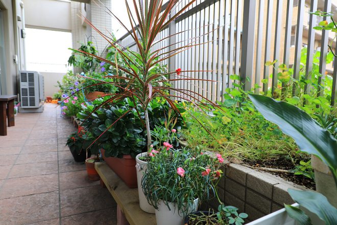南向きのベランダには、奥様が普段から丁寧に手入れされている観葉植物が目を休ませてくれます。桔梗や日々草、サルビアなどなど。南向きに面しているので、栄養分もたっぷりです。「かつてこのあたりは、段々畑や竹林ばかりでした。夏も涼しく、とってもすごしやすいところでした。こうして観葉植物などを取り入れているのも、そんな昔が懐かしいせいもあるんですけどね」と奥様。千里一帯は、1970年の万博開催を機に都市開発が急速に進みました。時代がいくら便利になっても、潤いだけは残しておきたい気持ちはよくわかります。