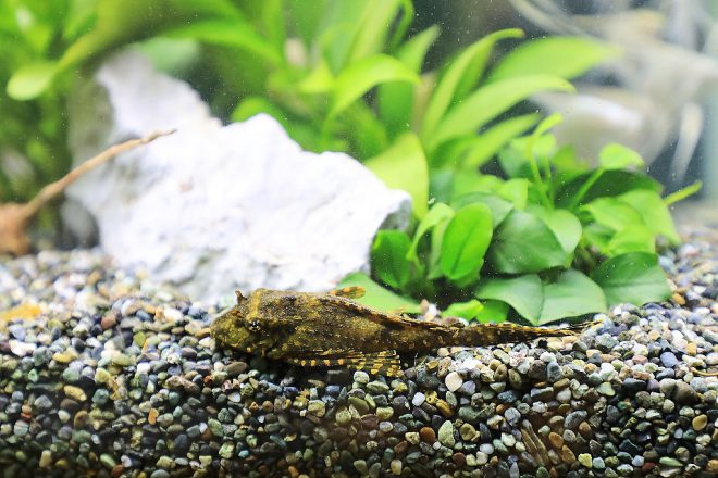 「この魚も最近は可愛く思えてきました」(ご主人)。ちょっと個性的な外観(笑)、最初は少し抵抗があったそうです。いやいや、お掃除担当のプレコは水槽内では家政婦さんなのですから、いてもらわないと困ります(笑)