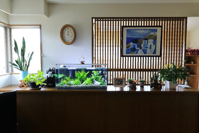 リビングルームからのながめもかなりイケてます。視線の高さもちょうどいい感じです。「やっぱり(水槽を)置いてよかったです」。見た目だけでなく、空気が乾燥しがちな冬場では加湿器代わりになり、健康維持にも一役買っているそうです。