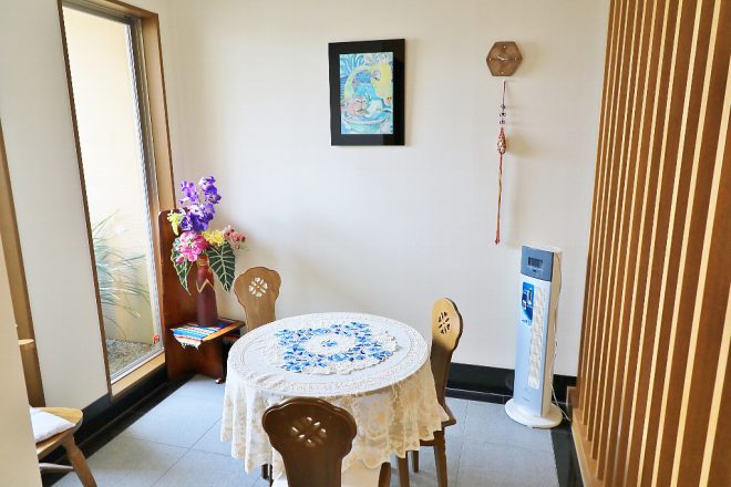 玄関を入ってすぐにある、「第一次応接室」。もしかしてアクアリウムがここに?「いえいえ、ここではありません(笑)」と奥様。ちなみに古樫さん宅は、広さ160平方メートル。バリアフリーはもちろん、間仕切りなどちょっとしたところに和テイストを随所に取り入れた住まいが特徴です。アクアリウム登場まで、あと少し(笑)