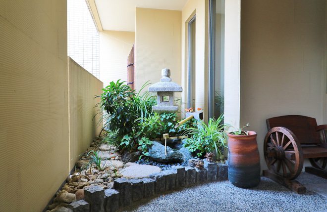 自己所有のマンションのワンフロアすべてが、オーナーの古樫さんのご自宅です。エレベーターから降りると、玄関前には純和風な風景が。洋から和へ、まるで別世界に飛び込んだような素敵なエントランス。「マンションを建てる前は、ここに自宅があったんです。すべて処分してしまうのも忍びないので、当時敷地にあった燈籠を持ってくることにしたんです」(奥様)。植栽とつくばい、そして時代を受け継いできた石灯籠が、私たちをほっこり迎えてくれました。