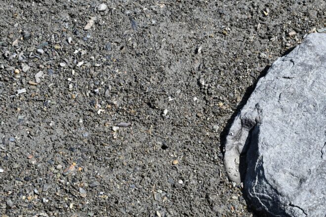 大人の事情で干潟に直接下りることができなかったので、陸地から下へ向かって観察。10分ほど見渡したでしょうか、直径1㎝程度の穴がいくつもあいているのに気づきました。