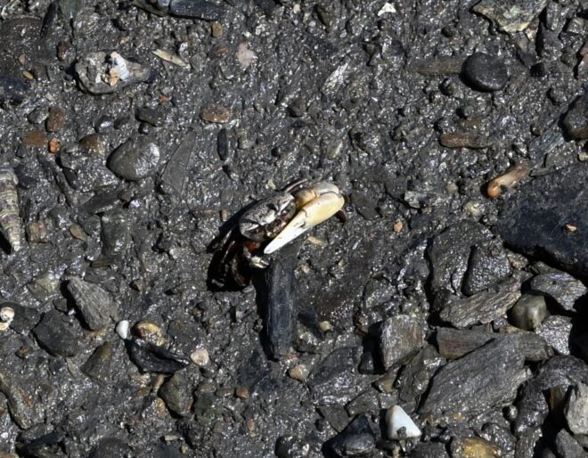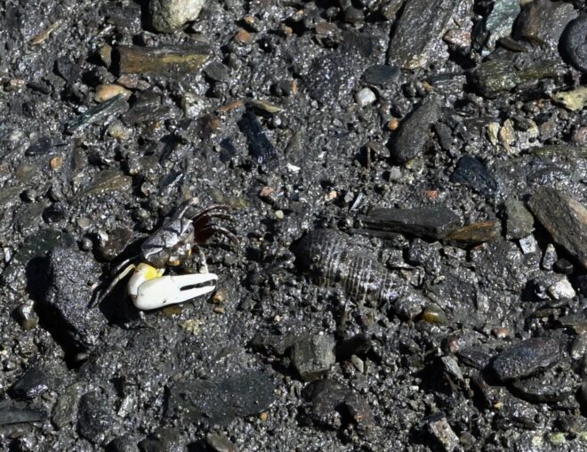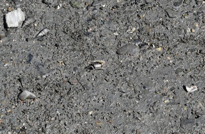 この子は右利き?ハサミが大きい側が利き手?知らんけど。ハサミだけでなく、甲羅の模様が今風で何かカニらしくなくてカッコよさげ。初めて見るハクセンシオマネキ。熱中症警戒アラートが発令されてさえいなければ、いつまでも見ていたい気持ちでした。