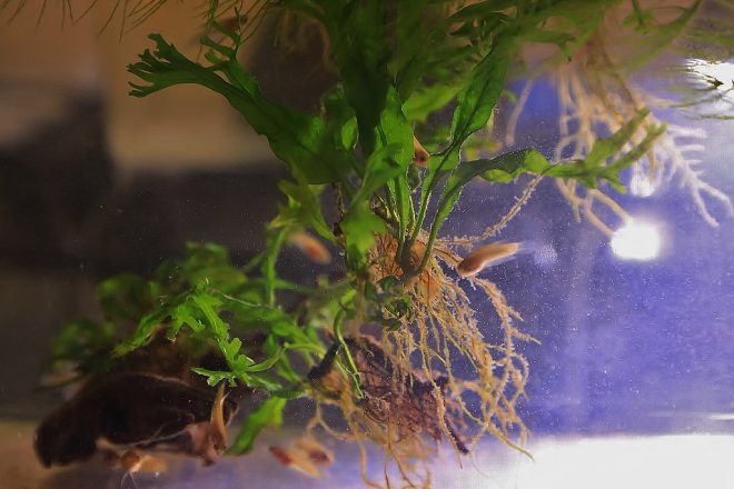 ちょっと見づらいと思いますが、デニスヨンギーの幼魚たち。お父さんの元を卒業して若魚たちだけになりました。このあと、生後半年から1年以上かけてコンテストレベルにまで育てるそうです。若魚たちが落ち着けるように水槽内にはウォータースプラウト、マツモ、ミクロソリウムなどが投入されています。ベタも人も緑は大事!