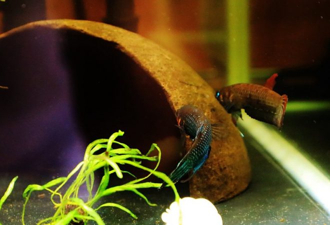こちらには、ショーベタも多数。野生のベタに最も近い姿をしているといわれるプラカット。ヒレが短いタイプです。