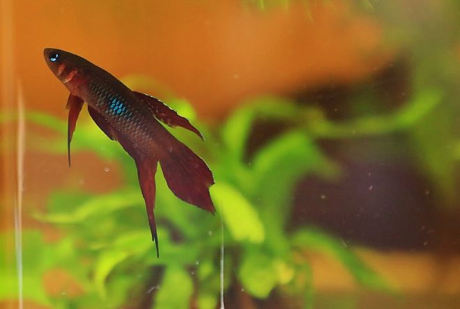 ワイルドベタ コッキーナのオス。体の中央に小さなグリーンやメタリックブルーの斑紋が入る種類です。体色は個体差が大きく、この模様がまったくない品種のものもあるそうですが、こちらは美しい模様がきちんと入っています。