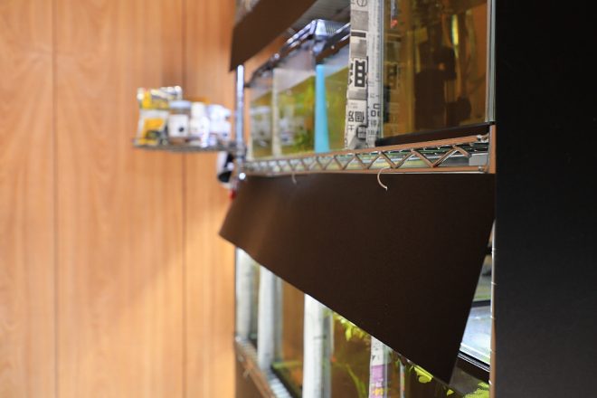 それぞれの段の仕切りには、黒いダンボールで開閉自由。もちろん自作。これって、今ショップなどで主流になっているタイプのものですよね。