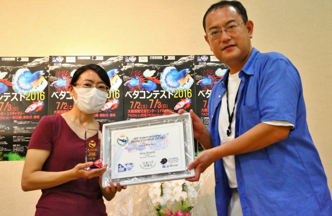 いつもニコニコ、えくぼもクッキリ、でもマスク(笑)。マスクはともかく、そんな愛くるしいキャラの平井さんに最初に出会ったのは、3年前のコンテストでした。いいタイミングでワイルドベタが生まれたのをきっかけに、思い切って初出品。以後平井さんは毎年出品し、さまざまな賞を受賞。今一番脂の乗っているベタ女子かも知れません。