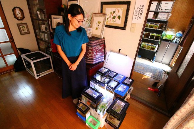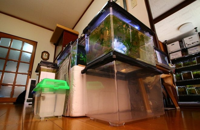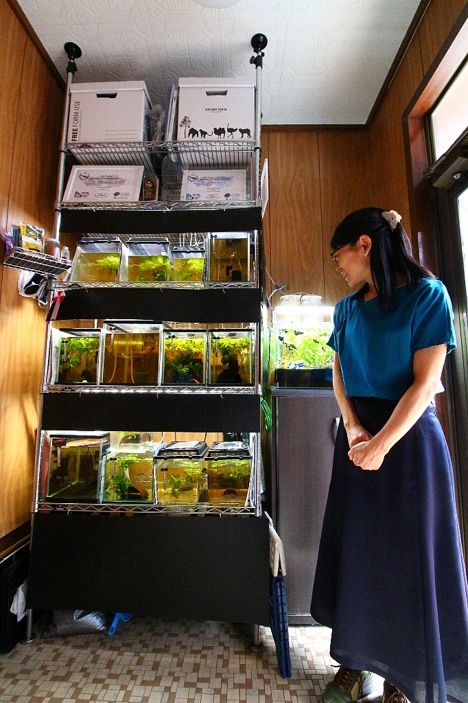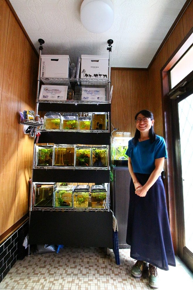 「以前、家の中で水漏れを何度かさせてしまったので、ここしか置くところがなくて(笑)」。今は玄関周りに集中的に置かれた水槽。水替えは、1~2週間の間隔で。すべの水換えには、やはり丸1日必要ですが外に近いので排水は楽になりました。それにしてもちょっとポカポカ暖かすぎない?「そうなんです。夏とかは日が当たりすぎるので、影をつくるように工夫してます」。