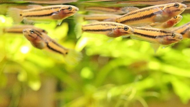 こちらはマクロストマの幼魚たち。何だかみんなすました顔して泳いでいます(平井さん提供)。