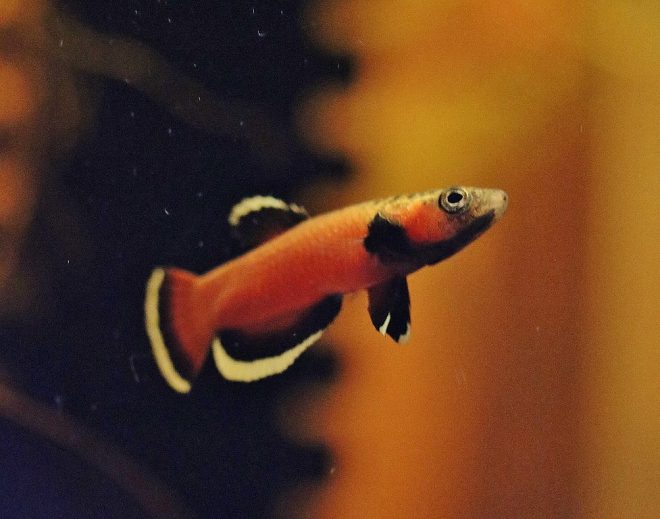 生後約2カ月のアルビマルギナータ。3カ月経つとオスにラインが表れてくるので、オスメスの判別が可能になるのだとか。この画像でもうっすらとヒレにラインが入り始めているのがわかります。