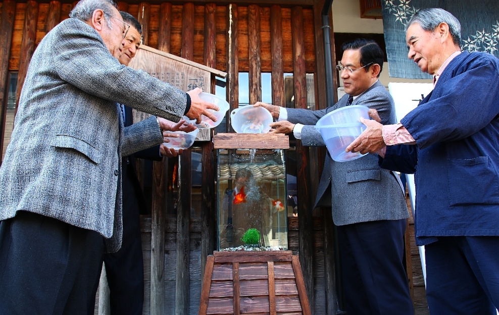 市長を中心に地元の自治会長さんらの手によって金魚が無事投入されました。
