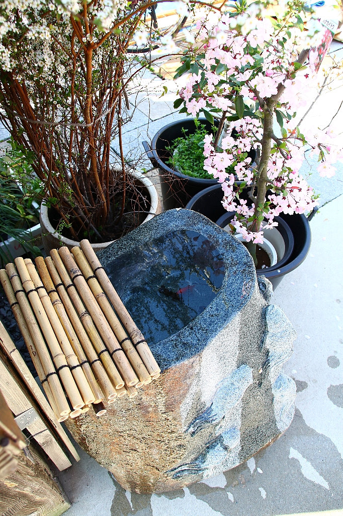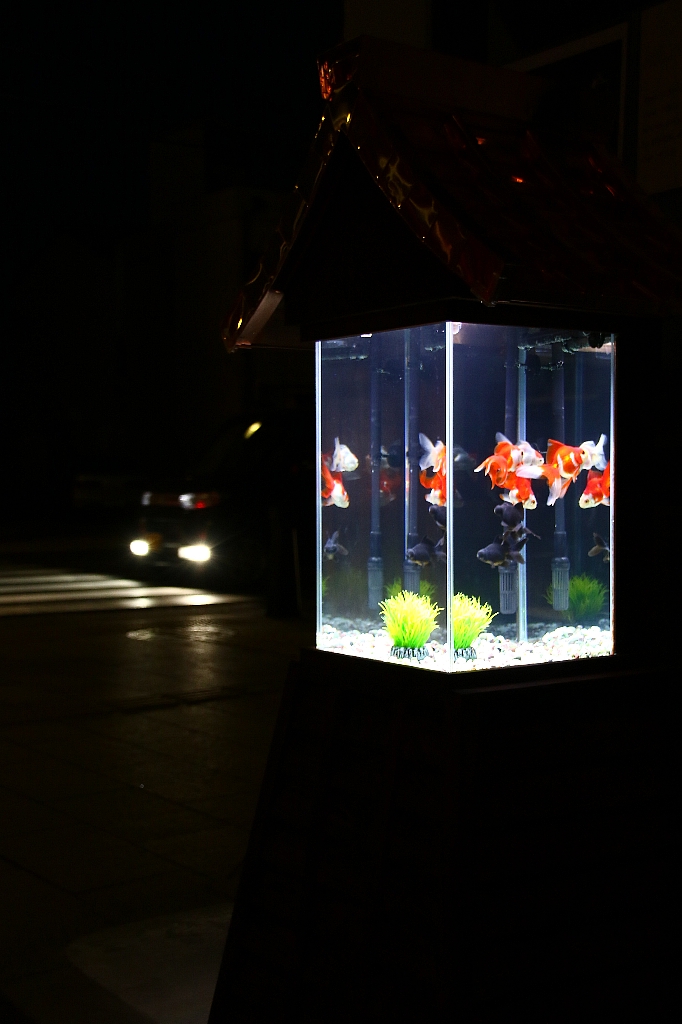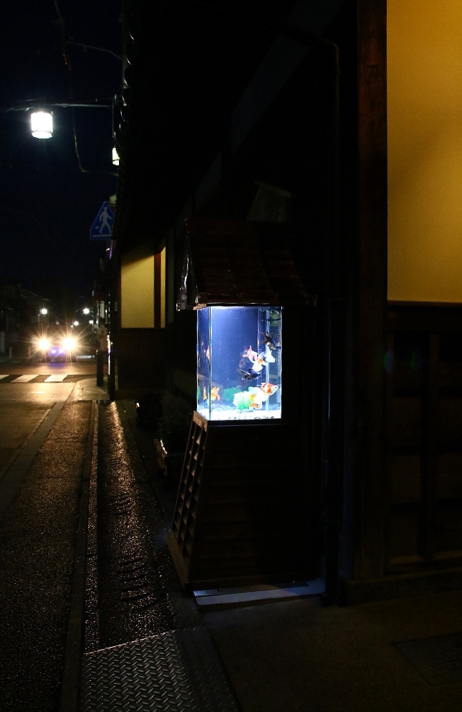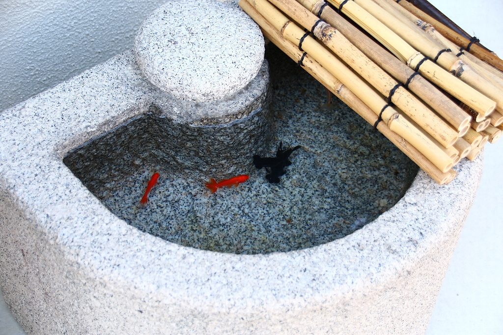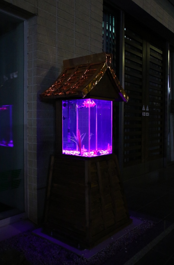よくみると、木製の燈籠に縦長の水槽がビルトインされています。
