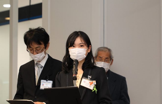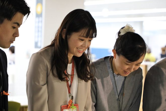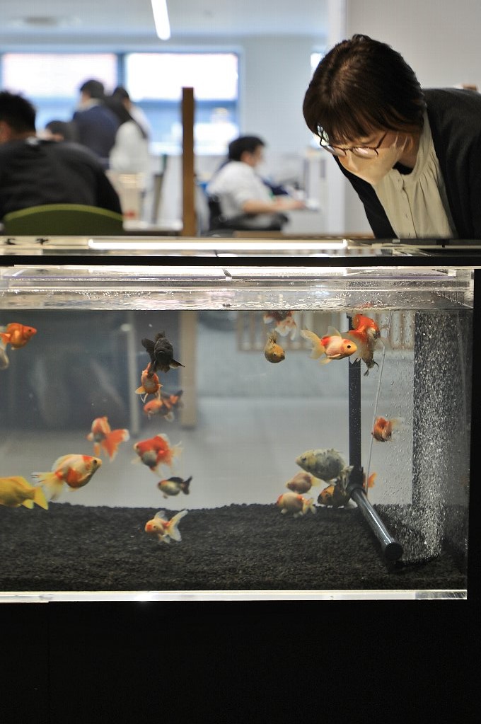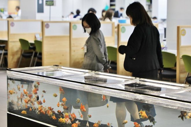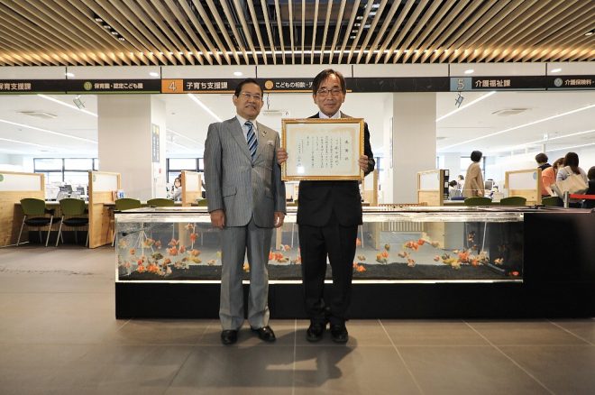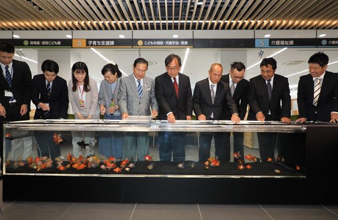 若手職員で構成された金魚水槽を運営管理する「ザ・チームきんとっと」のメンバーも。何を隠そう、今回の水槽設置にあたっては彼らが色々とアイデアを出して実現にこぎつけたのです。同チームを5年前に取材した時は水槽3本でしたが、新庁舎では1本なのでメンテが楽になったのか、あるいは人目につきやすいところだから逆にメンテが大変なのか。市民の反応はどうだったのかなど、水槽が落ち着いたら改めて取材してみようと思っています。