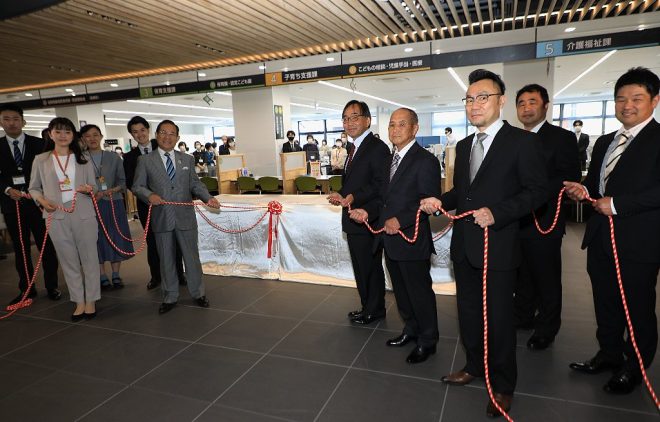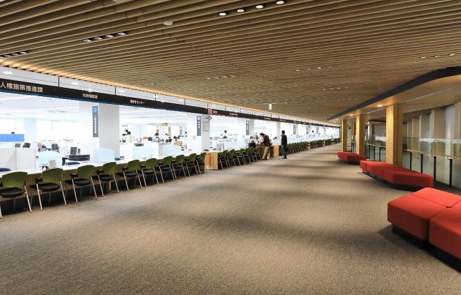 真新しく広々とした新庁舎。町家イメージの縦格子、免震構造、そしてシンボリックな金魚水槽。