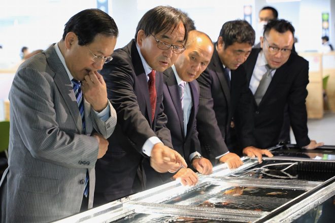 そしてお披露目。いよいよこの日がきました。これが新しい時代を予感させる令和の金魚水槽。関係者がいっせいに水槽のそばまでジリジリと。少し背が低い気もしましたが、横からだけでなく上見ができるようにも配慮された設計です。