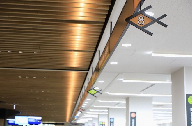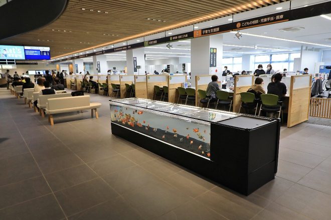 シンボリックに置かれた金魚水槽、役所に用事がなくてもこれを見にくるだけでも価値ありとみました。ちなみに、新庁舎の正面玄関はしばらくは使えないので、建物の北側(駐車場のあるほう)からが導線となります。場所は、【4.子育ち支援課「こどもの相談・児童手当・医療」】の窓口前が目印です。