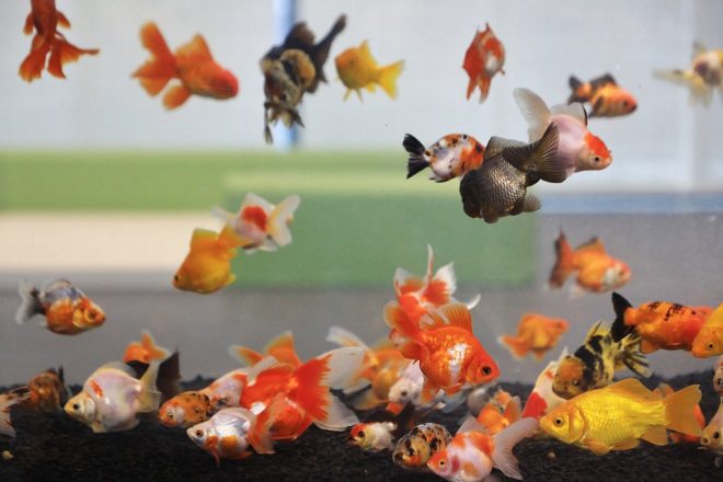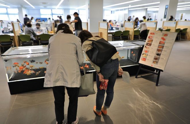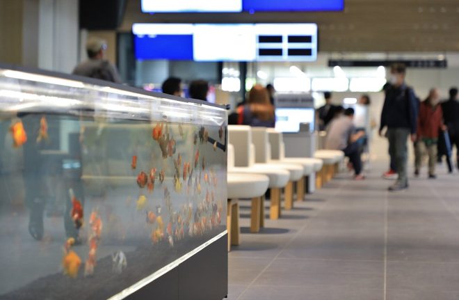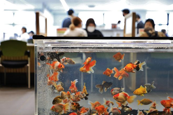 急に出現した金魚水槽を見つけて、通りかかる人たちからも熱い視線が。毎年秋に同市で開催されている金魚メッセの会場のよう。