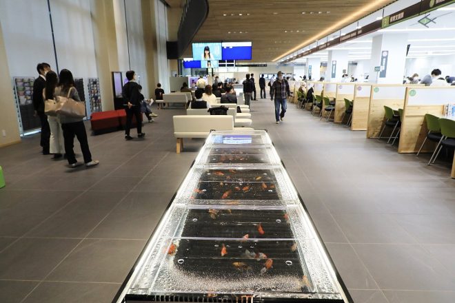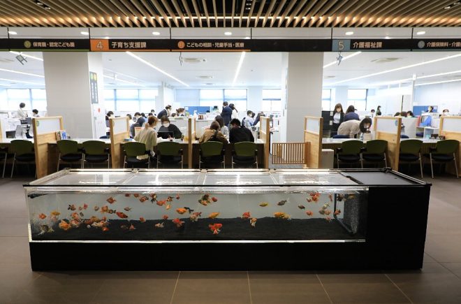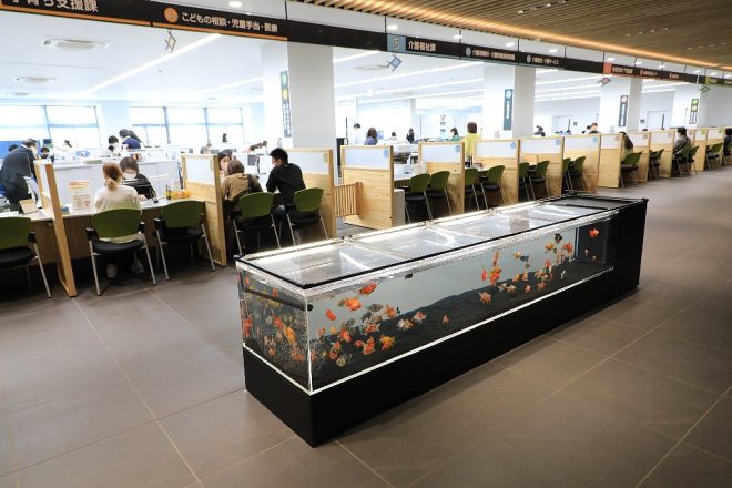 昭和36年に建てられた奈良県・大和郡山市庁舎が、このほど完全リニューアル。5月初旬に市庁舎のオープニングセレモニーが行われました。同時に、これまでエントランスに置かれていた金魚水槽もリニューアル。きんぎょのまち・大和郡山にふさわしい再スタートを切りました。一体どんな金魚水槽が登場したのでしょうか。