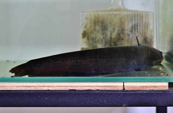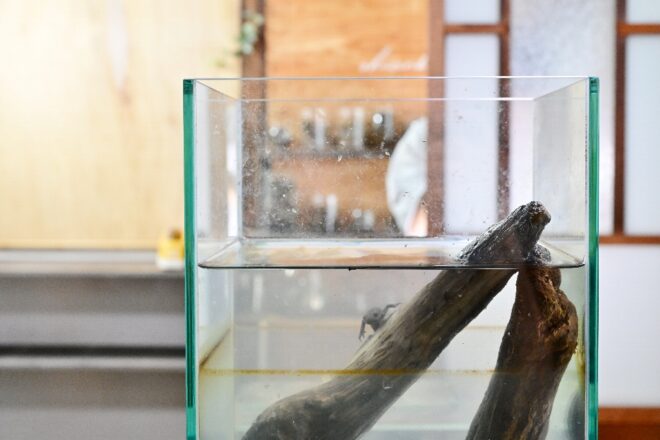 もともと長屋にあったレトロな座卓をちゃっかり水槽台にしているニホンウナギ。この日は、ずっとパイプの中にいて出てきてくれませんでした。パイプは避暑地かよ。