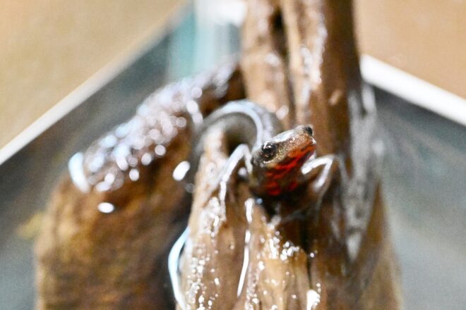 「ボクのおなか、赤いでしょ?」。よく見ると、アカハライモリ。めっちゃ近い。