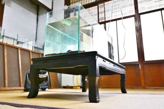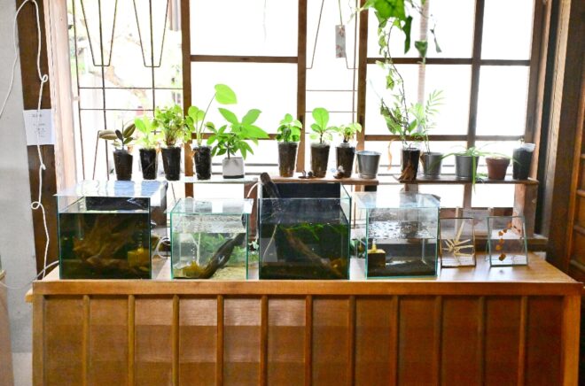 窓際に並んだ水槽の下にはレトロな水槽台?いえいえ、かつてこの長屋で使われていた襖の戸を横に置いて再利用したものなんです。
