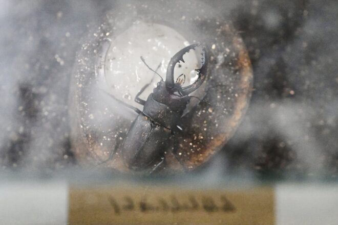 みんな大好きノコギリクワガタ。このほかミナミメダカやギギ、モクズガニといった、八尾産の生きものも展示されていました。