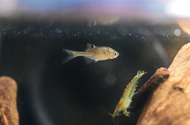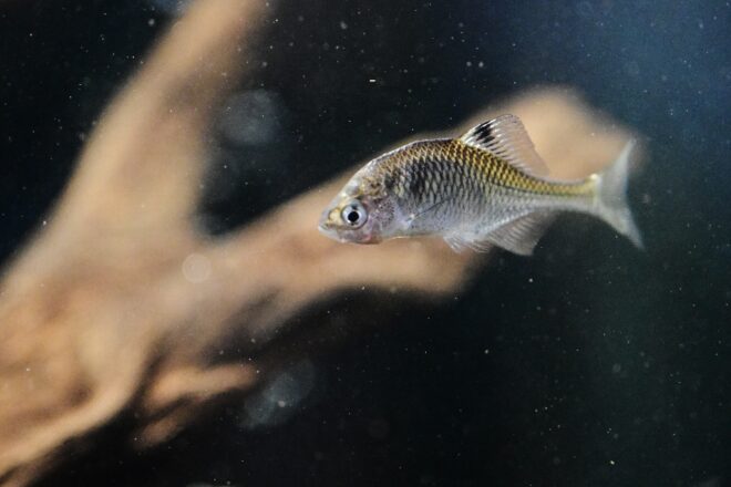 ってことで、キンタイ=ニッポンバラタナゴ登場。おお~、ここで見ることができるのですね。数匹が元気よく泳いでいます。確かにキラキラと光っていますが、婚姻色になるとやや赤みを帯びてくるのだそう。