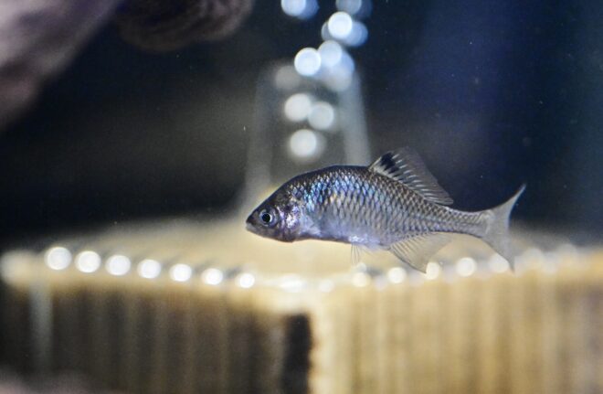 絶滅危惧ⅠA類。コイ科バラタナゴ属。体長は約3㎝で、かつては西日本に広く分布していたそうですが、八尾では一定のエリアのため池のみに生息。ドブガイなど主に二枚貝に産卵して育つ、まさに生物多様性の象徴ともいうべき生体です。