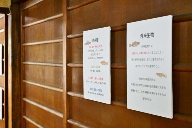 レトロな空間にはこんな解説パネルも。「外来種と外来生物の違いってわかります?」と平山さん。うーん。恥ずかしながらキワメテスタッフは即答できませんでしたが、読者のみなさんならわかりますよね、たぶん。違いがわからない人はぜひこちらへ。